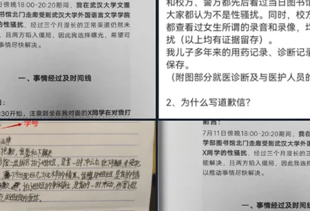 事件起源于2023年7月,武汉大学女生杨某在社交平台发文,称在图书馆自习期间,坐在对面的男生肖某某对其“摩擦生殖器”。该帖引发巨大关注,两天后武汉大学发布通报,对肖某某给予记过处分,却未详细说明违规情节。