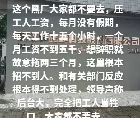 更令人气愤的是,一旦员工提出辞职,公司不仅不立即结算工资,还常常拖延两到三个月。部分工人透露,他们在多次交涉无果后被迫继续加班,以免彻底失去工资。更有离职员工直言:“干到最后拿不到钱,感觉像被掏空了。”
