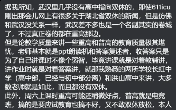 他指出,虽然当时网络一度流传“湖北省将落实高中双休”的新闻,但对武汉而言形同虚设。尤其是长虹中学(高中部)和洪山高中等学校,教学质量参差不齐,老师多为“PPT朗读机”与“答案复读机”,课堂上照本宣科,缺乏真正讲解与引导。