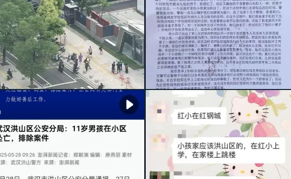 唐人日报6月4日讯:湖北武汉洪山区一名11岁男孩高某某在所居住小区不幸高坠,送医后抢救无效身亡。次日,警方通报称排除刑事案件,正在会同相关部门做好善后。但家属在网络发布长文,直指孩子生前疑似在校遭遇体罚与霸凌,事件真相并未查清。