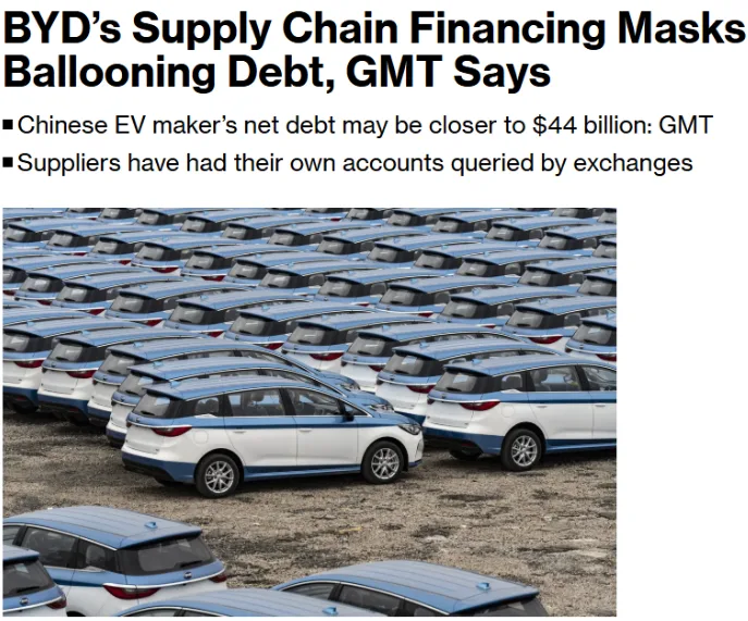 彭博社20日报唐人日报1月25日讯:近日,香港沽空机构GMT Research指出,比亚迪供应链融资问题值得关注,疑似“上瘾”于此类融资方式。GMT本月10日发布的报告显示,若重新计算因出售或借贷剔除的应收账款,并将超过90天的应付账款视为债务,比亚迪的实际净债务高达3230亿元人民币,远超官方公布的277亿元人民币。