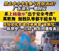 唐人日报10月24日讯:广东省汕头市澄海区陈店镇政府发布的一封《致学生家长的信》在网络引发轩然大波。文件明确规定,中小学生不得参与任何形式的民俗活动,包括潮汕地区极具代表性的英歌队、腰鼓队以及游神游行表演等。这一禁令迅速在社交媒体上引起热议,被不少人质疑为“以安全之名行文化禁锢之实”。