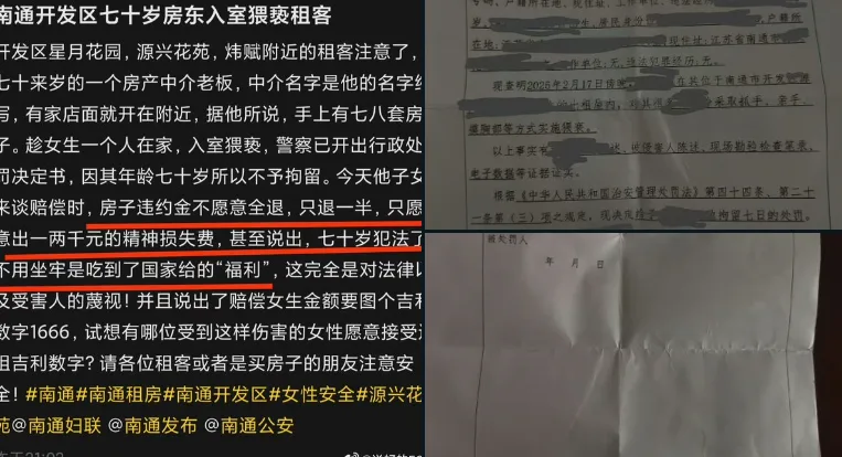 唐人日报2月21日讯:近日,江苏南通男子称,其女友在租住的房屋内遭七旬房东入室猥亵。女友反抗并报警后,房东才害怕离开现场。警方对房东作出行政拘留7日的处罚,但因其年满70岁,最终未被执行拘留。事后,房东竟称“七十岁犯法了不用坐牢是吃到了国家的‘福利’”。