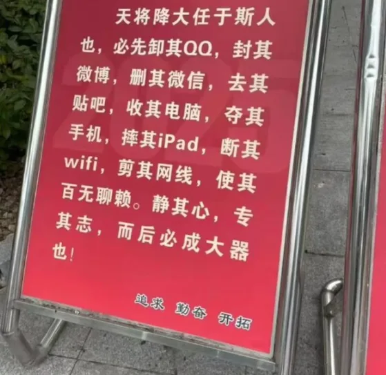 唐人日报2月21日讯:近日,江苏盐城新丰中学在校内张贴的标语改编孟子名句,引发广泛关注。标语写道:“天将降大任于斯人也,必先卸其QQ,封其微博,删其微信,去其贴吧,收其电脑……而后必成大器也!”该改编意在提醒学生注重学习,减少社交网络干扰。