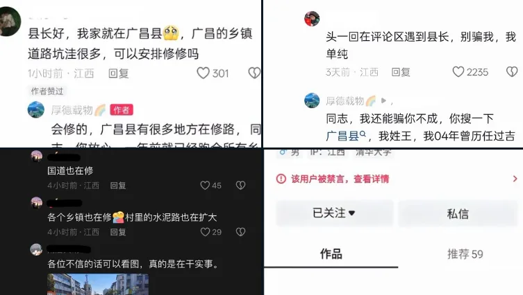 唐人日报1月19日讯:近日,江西广昌县,一名网名为“厚德载物”的用户自称是广昌县县长王峰,在抖音平台上回应民众诉求,并声称自己从乡镇一直做到县长,保证不是骗子。然而,网友们对此表示质疑,平台随后封禁了该账号。