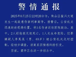 唐人日报8月27日讯:江西景德镇振兴大道突发一起故意伤害案件,现场惨烈,瞬间打破了城市的宁静。景德镇市公安局珠山分局8月26日发布警情通报称,案件发生于当晚22时20分,三人当场受伤,其中两人经全力抢救仍不幸身亡,一人暂无生命危险。嫌疑人李某某(男,40岁)已被迅速控制。