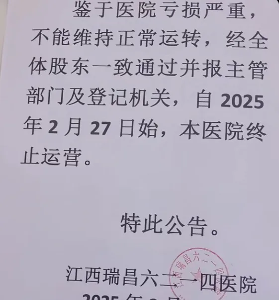 唐人日报2月28日讯:近日,江西瑞昌六二一四医院因长期亏损严重,正式宣布终止运营。该医院已有50多年历史,是当地知名医疗机构。医院工作人员确认公告属实,60多名员工中有部分选择自动离岗或另谋生路,病人则已被转院处理。