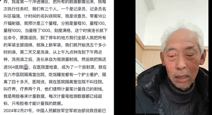 唐人日报2月16日讯:近日,江西上饶,退伍老兵张天鉴表示,自己曾参与中国核试验,冒着生命危险进入核爆区记录数据,为国家核事业做出贡献。然而,随着年纪增长,张天鉴身体多病,长期未能获得应有的抚恤金。