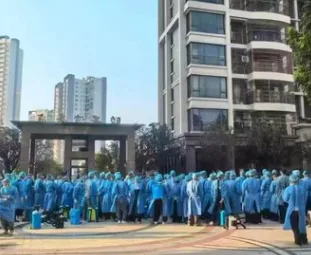 据市民拍摄的视频显示,防疫人员身穿防护服、背着喷雾机,沿着小区主干道和楼栋外墙持续喷洒白色药液。部分小区夜间仍有作业,雾气在路灯下翻滚,宛如烟幕。居民称,当晚空气中弥漫着明显化学气味,部分老人和儿童出现咳嗽、喉咙刺痛等不适症状。