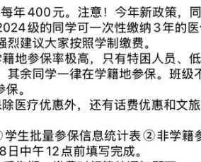 唐人日报9月19日讯:河北保定市出台的一份针对高校学生的医保政策文件在网络上引发热议。文件明确要求,除少数特困人员外,大学生必须在学籍地统一参保,每人每年缴纳医保费用 400 元,还特别鼓励学生一次性预缴三年费用。对于未能及时参保的学生,文件甚至列出了长达一整段的“八种损失”,以警示其后果。
