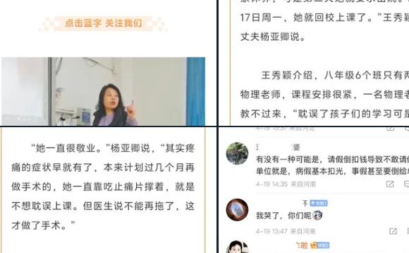 报道将王秀颖描述为“敬业楷模”,其“坚守讲台、心系学生”的行为被高度赞扬。然而,该报道一经发布,迅速在网络上引发争议。