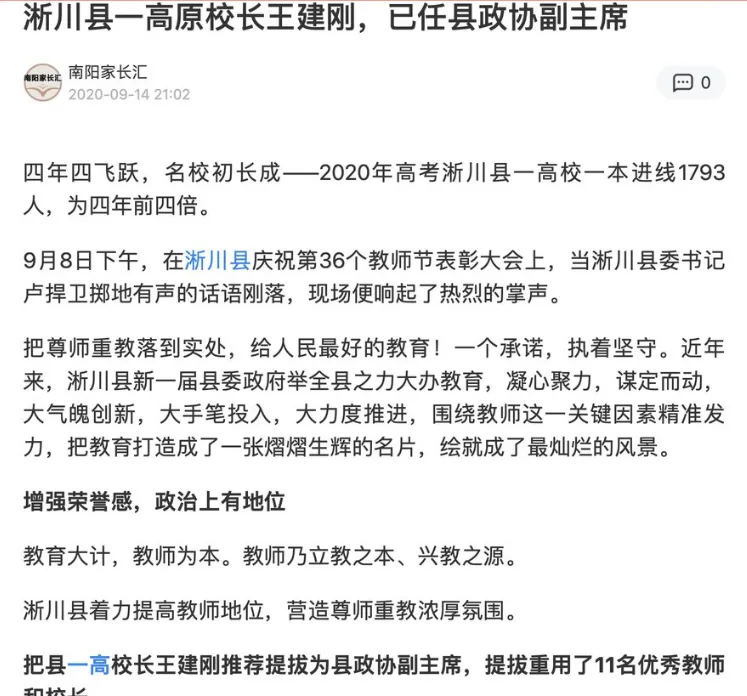 唐人日报3月23日讯:近日,原河南南阳淅川县一高校长王建刚的职业生涯因其“高压政策”而备受争议。据透露,王建刚凭借对学生实施严苛的管理手段提高学校的一本率,最终获得了升迁机会,并被任命为县政协副主席。随后,他又被北海市委书记人才引进到北海中学,年薪高达百万。