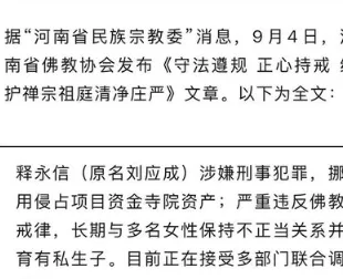 河南省佛教协会公开点名释永信:涉嫌刑事犯罪,严重损害佛教形象