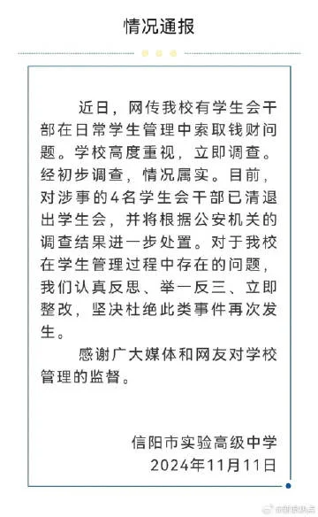 唐人日报11月12日讯:近日,河南信阳实验高中学生会干部因涉嫌索贿被举报,警方已介入调查。律师指出,学生会干部以查违纪为名向同学索取钱财,符合敲诈勒索罪的要件。4名涉事学生会干部已被清除,学校将根据调查结果进一步处理。教育专家表示,部分学校学生会存在官僚化现象,建议加强管理及让学生推选干部,提升自我管理和服务意识。