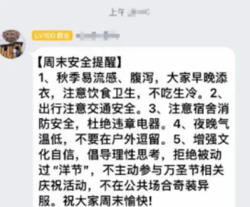 校方指出,近年来部分高校出现学生在万圣节期间化装游行、网络打卡等现象,造成不良舆论影响,“与社会主义核心价值观不符”。学校要求学生“拒绝崇洋媚外”,同时鼓励在重阳节、端午节等传统节日期间开展校园文化活动,以“传承中华精神、强化文化自信”。