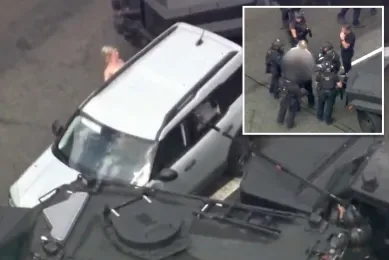 据洛杉矶警察局介绍,事件最初源于居民报警称,一名裸体女子在街头尖叫并涉嫌袭击。接警后,警方在西好莱坞街头发现目标车辆,并展开短暂追逐。航拍画面显示,该女子驾车疾驰,后座还有一只小狗。很快,警车将她包围,但她拒绝下车,还一度从车窗抛出一把锤子。