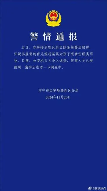 热门头条 济宁育儿嫂疑给婴儿喂安眠药 警方:涉事人员已被控 0 唐人日报11月21日讯:山东济宁市公安局高新区分局通报,接到居民陈某报警称怀疑育儿嫂杨某某给孩子喂食安眠类药物。警方已介入调查,涉事育儿嫂已被控制。目前,案件正在进一步调查中。Continue ReadingPrevious 迈阿密餐厅惊爆持刀伤人事件,嫌犯被拘Next 迈阿密突现连环抢劫案 嫌犯被捕 延伸阅读 热门头条 密密麻麻!福建一查扣点堆满电动车 网友:这得罚了多少人 0 热门头条 马路中间举锦旗“致谢”!上海美团骑手街头控诉报酬被克扣 0 热门头条 退市多年负债超两百亿,乐视网突然宣告要拿1.8亿元炒股 网友:为何不还债? 0 热门头条 陕西未完工自建房遭强拆 村民哭诉无家可归 0 热门头条 广东潮州沙溪镇突发工厂大火:火势迅猛冲天,黑烟压顶! 0 热门头条 像货车司机一样强制休!外卖新国标引热议 骑手怕收入缩水 0 发表回复 取消回复您的邮箱地址不会被公开。 必填项已用 * 标注评论 *显示名称 * 邮箱 * 网站 在此浏览器中保存我的显示名称、邮箱地址和网站地址,以便下次评论时使用。