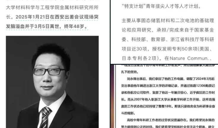 唐人日报3月13日讯:近日,浙江大学教授刘永峰在西安出差会议期间突发脑溢血,经过40多天的抢救,最终于3月5日不幸离世,终年48岁。刘永峰教授的猝然离世,引发了学术界和社会对高校教师高强度工作压力的深刻关注。