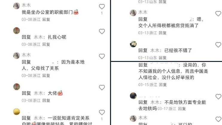 面对质疑,“木木”不仅未作澄清,反而回应称:“没用的,你不知道我的个人信息,而且中国是人情社会,没什么好举报的。”这一回应被网友认为态度傲慢、挑战公序良俗,也引发了对“关系就业”“权力寻租”等社会现象的强烈批评。