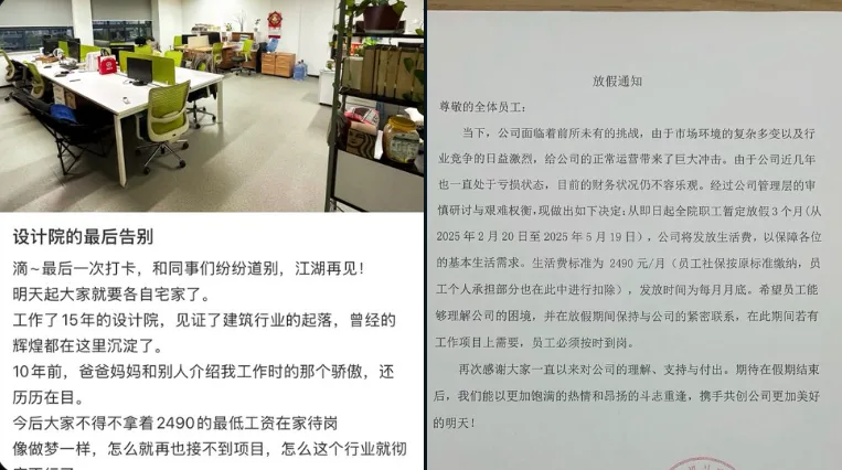 唐人日报3月1日讯:近日,浙江城乡综合设计院因持续亏损,决定自20日起全体职工待岗三个月,期间发放2490元/月的生活费。该院一名在职员工表示,十多年来亲眼见证了建筑行业的变化,回忆起十年前,自己父母还以行业成就为荣。