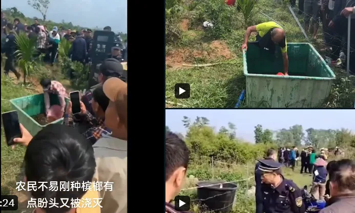 唐人日报3月22日讯:海南定安县雷鸣镇近日发生一起因强行拆除槟榔园引发的村民反抗事件。当地政府以“村民在基本农田种植槟榔”为由,派出挖掘机强行拆除村民种植的槟榔,导致村民愤怒反抗,冲突一度升级。