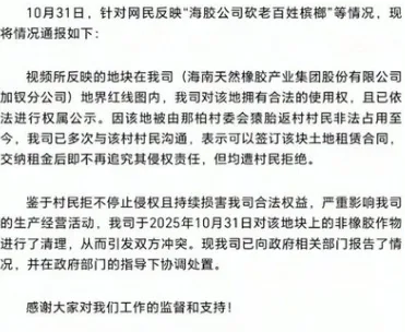 针对村民的指控,海胶公司方面在通报中未正面回应“偷砍”一事,仅强调公司“依法依规开展生产经营活动”,并表示部分村民“误解公司行为”。公司呼吁当地群众保持冷静,“通过法律途径反映诉求,不要采取过激方式”。