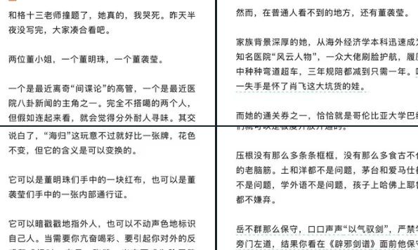 他写道:“董明珠拼命向底层拱火,说‘海归派’是外人,是别有用心之人。但看看董袭莹在医学界的一路开挂,就知道某些‘海归’,恰恰是‘自己人’——是天龙人。最终,只有吃瓜群众被耍得团团转,愤怒得找不着北。”