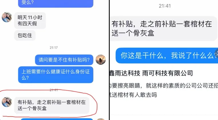 唐人日报2月21日讯:近日,广东深圳一名网友向某工厂询问是否有关于不住宿舍的补贴,未料到对方竟回复:“补贴一套棺材和骨灰盒”。该言辞引发网友强烈反响,纷纷批评企业态度恶劣。根据网传信息,涉事企业为深圳市鑫雨达科技有限公司。
