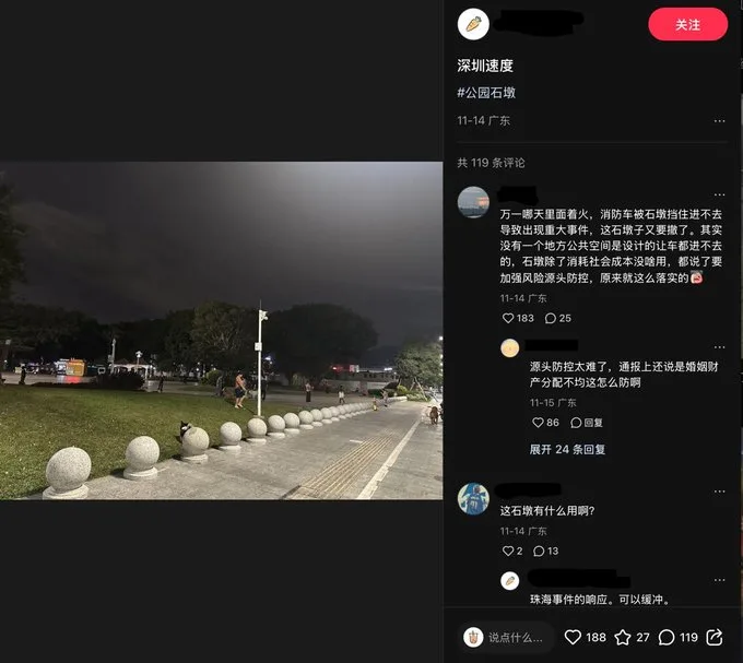 热门头条 深圳公园石墩引争议 相关部门尚未回应 0 唐人日报11月27日讯:有网友发现珠海事件后深圳在公园放置石墩,引发质疑。评论区担忧石墩可能阻碍消防车和救护车通行,还有网友关注残疾人出行问题。此举引发广泛讨论,相关部门尚未回应。Continue ReadingPrevious 18000美元!圣何塞零售盗窃嫌疑人被捕,遭重罪指控Next 涉事10人被刑拘 南京火灾调查公布 延伸阅读 热门头条 密密麻麻!福建一查扣点堆满电动车 网友:这得罚了多少人 0 热门头条 马路中间举锦旗“致谢”!上海美团骑手街头控诉报酬被克扣 0 热门头条 退市多年负债超两百亿,乐视网突然宣告要拿1.8亿元炒股 网友:为何不还债? 0 热门头条 陕西未完工自建房遭强拆 村民哭诉无家可归 0 热门头条 广东潮州沙溪镇突发工厂大火:火势迅猛冲天,黑烟压顶! 0 热门头条 像货车司机一样强制休!外卖新国标引热议 骑手怕收入缩水 0 发表回复 取消回复您的邮箱地址不会被公开。 必填项已用 * 标注评论 *显示名称 * 邮箱 * 网站 在此浏览器中保存我的显示名称、邮箱地址和网站地址,以便下次评论时使用。