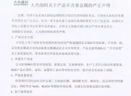 唐人日报7月11日讯:深圳大兴颜料有限公司突发声明,强调其生产的所有颜料“完全符合国际环保法规”,不含任何重金属成分,并明确表示该声明“与天水幼儿园血铅事件无关”。