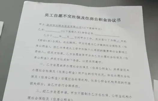 据多名员工反映,公司以“经营压力”“提升实际到手收入”为理由,要求员工自愿签署协议。一旦签署,企业将不再为其缴纳社保及公积金,而是将这部分费用“转入工资”,但不提供合法缴费凭证,也未明确说明法律风险。
