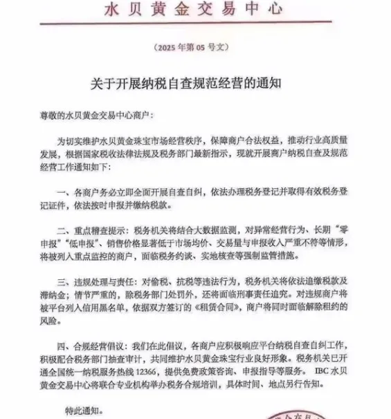水贝黄金交易中心是中国最大的黄金交易市场之一,汇聚了大量黄金珠宝商家。近年来,随着市场的快速发展和交易量的激增,税务合规性成为了监管部门特别关注的问题。此次通知不仅是对商户的提醒,也反映了政府对珠宝交易市场管理严格化的趋势。