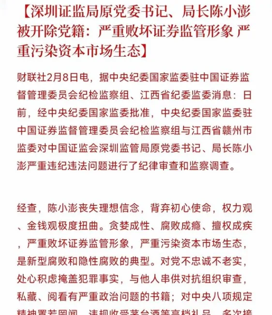唐人日报2月9日讯:近日,深圳证监局原党委书记、局长陈小彭因严重违反党纪,被中纪委开除党籍。陈小彭的行为被认为严重败坏了证券监管形象,并污染了资本市场生态。