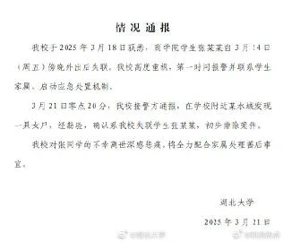唐人日报3月21日讯:近日,湖北省武汉市湖北大学发布通报,确认失联的商学院学生张某某已在学校附近水域被发现遗体,初步排除他杀案件。此前,张某某自3月14日下午五点多离开学校后失联,引发了社会广泛关注和担忧。