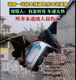 唐人日报2月7日讯:近日,湖南华容县白铺村发生一起交通事故,一辆出租车因车速过快,在急转弯处失控,冲入路边民房并撞进村民猪圈。事故发生后,白铺村一名村干部表示,所涉及的路段为急转弯地段,且未造成人员伤亡。