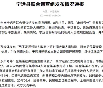 唐人日报8月25日讯:湖南永州市宁远县联合调查组发布通报,证实近日网民反映的棉花坪瑶族乡政府上班期间干部迟到、缺岗问题属实,并明确表示将对相关责任人依规依纪严肃处理,同时在全县范围内举一反三开展作风督查。