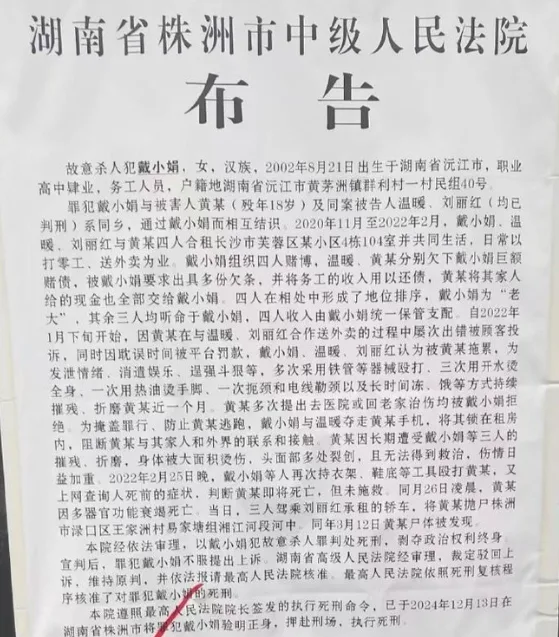 唐人日报3月2日讯:湖南省株洲市一起骇人听闻的杀人事件近日引起了公众极大的关注。根据株洲中院发布的通告,戴小娟、温暖及刘丽红三名女子因发泄情绪和娱乐,长达近一个月对其室友黄某实施了持续的残酷虐待和折磨,最终导致黄某死亡。