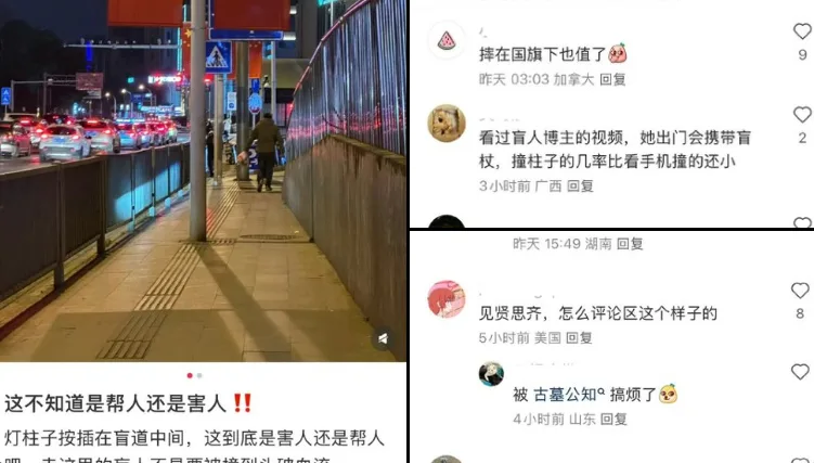 唐人日报2月16日讯:近日,湖南一处盲道被路灯柱占用,且柱子上悬挂国旗。拍摄者表示,盲人经过此地可能会被撞伤,质疑市政工程设计不当。对此,部分网民回应称:“你不爱国?”并认为摔倒在国旗下也算值得。另一部分网民则认为,盲人配有盲杖,不太可能撞到柱子。