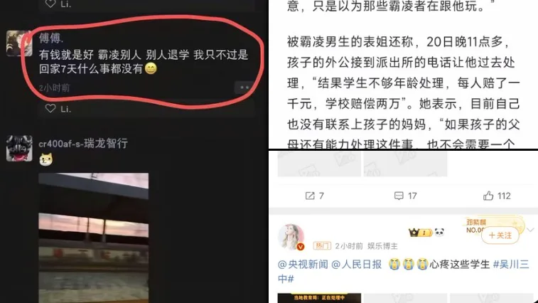 唐人日报2月22日讯:近日,湛江吴川三中发生一起校园霸凌事件。受害男孩有智力缺陷,目前已回家。网传一名霸凌者在朋友圈发文称:“有钱就是好,霸凌别人,别人退学,我只不过回家7天什么事都没有。”这一言论引发广泛关注。事件发生后,相关图片和视频在中国社交媒体平台陆续被删除。