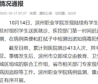 滨州官方通报诺如病毒致400余人就诊,学生却反映:校方最初隐瞒并归咎于“乱吃外卖”