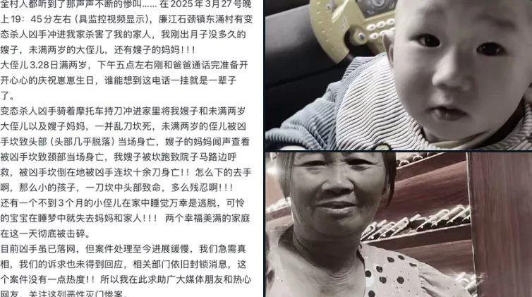 唐人日报4月4日讯:近日,广东省廉江市东涌村发生一起震惊当地的恶性案件。据遇害者家属控诉,3月27日晚,一名男子骑摩托车闯入家中,手持凶器将嫂子、年仅两岁的侄儿,以及嫂子的母亲残忍砍杀,三人当场死亡,现场惨不忍睹,疑似为有预谋的灭门惨案。