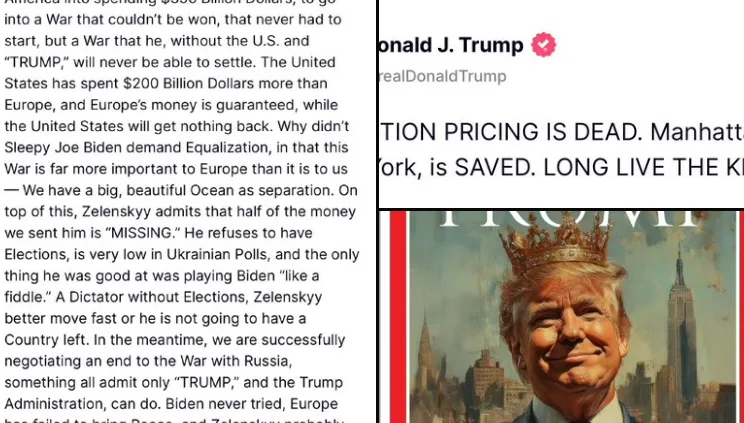 唐人日报2月21日讯:近日,特朗普针对泽连斯基的批评作出回应,指责乌克兰总统为未经选举产生的“独裁者”。四小时后,特朗普发布新帖称:“堵车费被封杀了,曼哈顿及整个纽约市都获救了。”并附上“国王万岁”的宣言。随后,白宫官方转发了特朗普的“国王万岁”贴文,并配上一张特朗普戴王冠的杂志封面图,图上标注“国王万岁”。