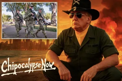 帖文还附上一张由人工智能生成的图片,画面中特朗普身披军装,坐在熊熊烈火与直升机掠过的芝加哥天际线前,造型酷似电影《现代启示录》中罗伯特·杜瓦尔的角色,配文则是:“我喜欢早上被驱逐出境的气味。Chipocalypse Now。”这张极具挑衅意味的图片迅速在社交媒体上传播,引发各界强烈反应。