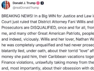 唐人日报9月17日讯:美国总统唐纳德·特朗普近日在社交平台发帖,宣告取得一场“历史性胜利”。佐治亚州最高法院裁定,富尔顿县地区检察官法尼·威利斯(Fani Willis)及其团队因严重失当行为,被永久取消资格,禁止继续就所谓“2020年选举干预案”起诉特朗普及相关人士。这一判决迅速在全美引发强烈震动,被视为美国司法体系一场里程碑式的逆转。