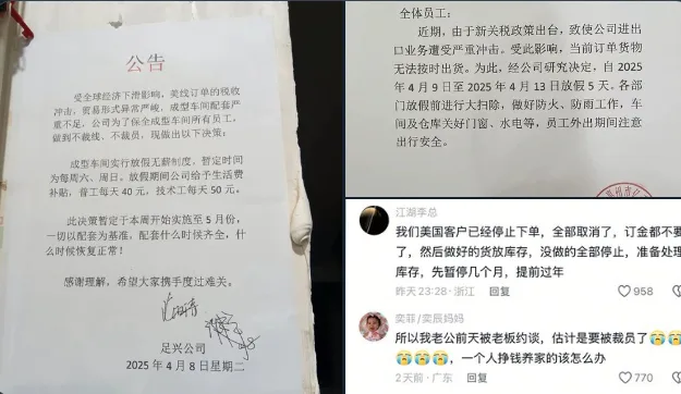 惠州亿禾家具公司则宣布因新关税政策直接影响出口业务,企业被迫暂时放假五天,是否复工尚未可知。