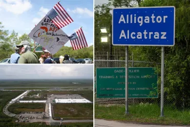 “鳄鱼恶魔岛”位于佛罗里达大沼泽地深处,原址是一座废弃机场。今年7月1日,佛州州长罗恩·德桑蒂斯动用紧急权力,仅用八天时间就让该拘留中心投入使用,最多可容纳2000人,并计划扩建至4000人。然而,法官认定这一建设严重违反了《国家环境政策法》(NEPA),政府绕过了必要的环境审查,对湿地、濒危物种以及当地Miccosukee部落的水源和食物供应构成巨大威胁。