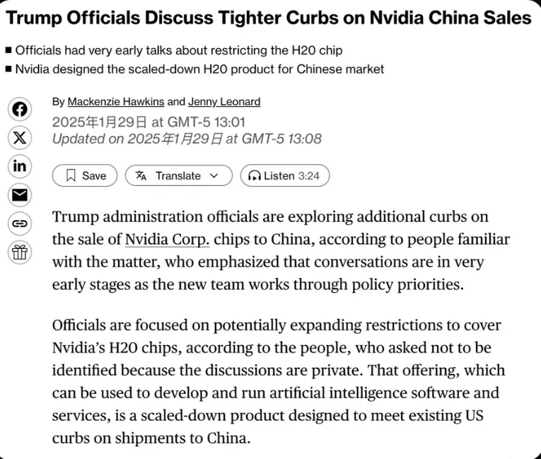 唐人日报2月1日讯:近日,据彭博社报道,特朗普政府官员正在讨论对英伟达在中国的销售实施更严格的限制,重点集中在英伟达的H20芯片。该芯片主要用于开发和运行人工智能软件和服务。为了遵守美国对中国的技术出口限制,英伟达已对该芯片的性能进行削弱。