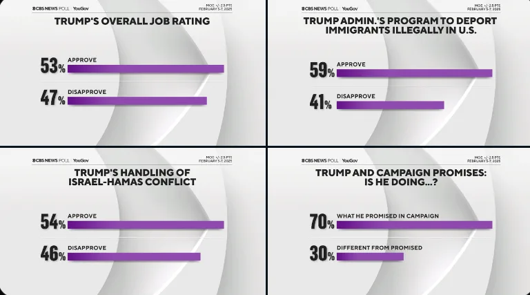 唐人日报2月13日讯:根据近日发布的民调结果,哥伦比亚广播公司(CBS)与民调机构YouGov联合调查显示,美国人对特朗普总统施政的满意度达到53%。70%的受访者认为,特朗普正在兑现竞选承诺,特别是在哈以冲突处理和驱逐非法移民等议题上,分别获得了54%和59%的支持。