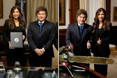 在米莱标志性金红色“电锯”雕塑旁,诺姆与其并肩竖起大拇指,象征双方紧密合作的象征。该“电锯”在米莱2023年竞选期间作为其削减国家开支、打破官僚体系的象征物广为人知。
