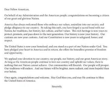 “美国现在是你们的祖国,你们是上帝统治下的一个国家的一部分,”特朗普在信中写道,“你们已经向美国宣誓了忠诚——作为回报,美国承诺为你们提供自由与机遇的无限可能。”他将这一誓言与美国建国精神相提并论,呼吁新公民珍惜宪法赋予的自由。